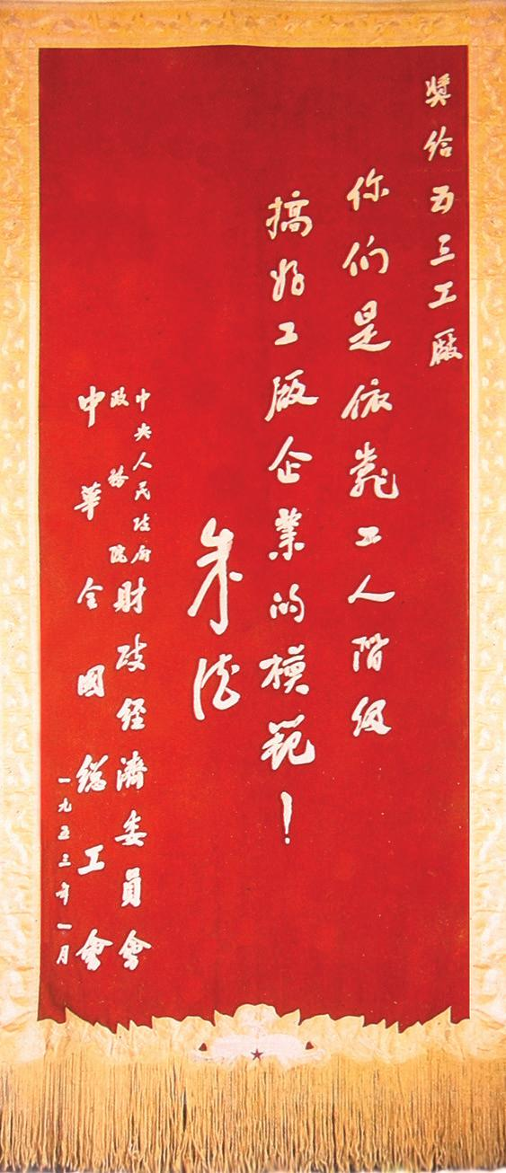 1月4日 朱德为奖励五三工厂的奖旗题词:“你们是依靠工人阶级搞好工厂企业的模范。”