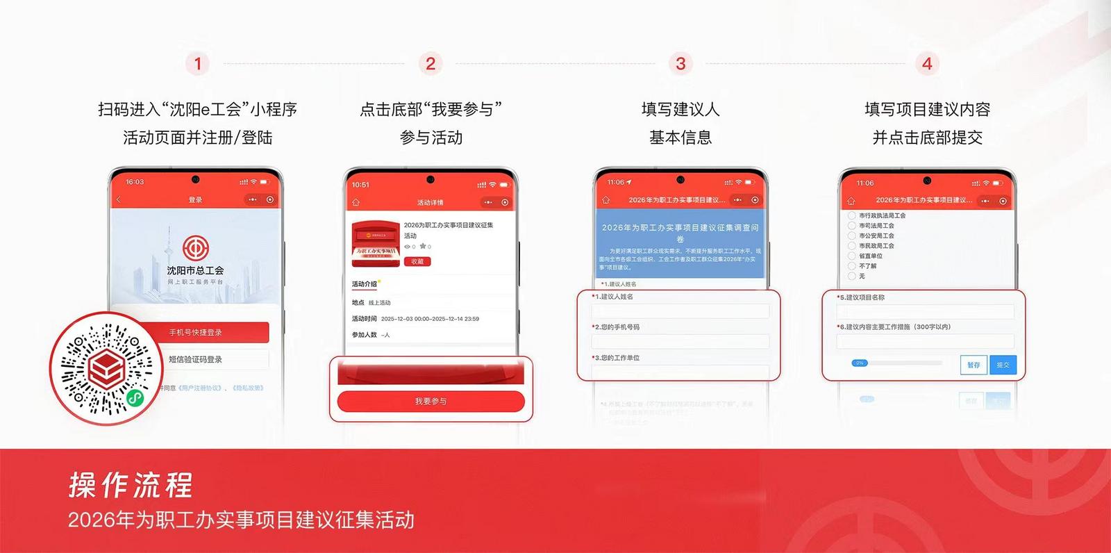 征集方式分为线上征集和线下征集两种。参加线上征集的职工群众,可以使用手机通过“沈阳e工会”App、“沈阳e工会”微信公众号或扫描二维码的方式提出自己的建议;线下征集活动由各区县(市)总工会、各产业工会组织开展。