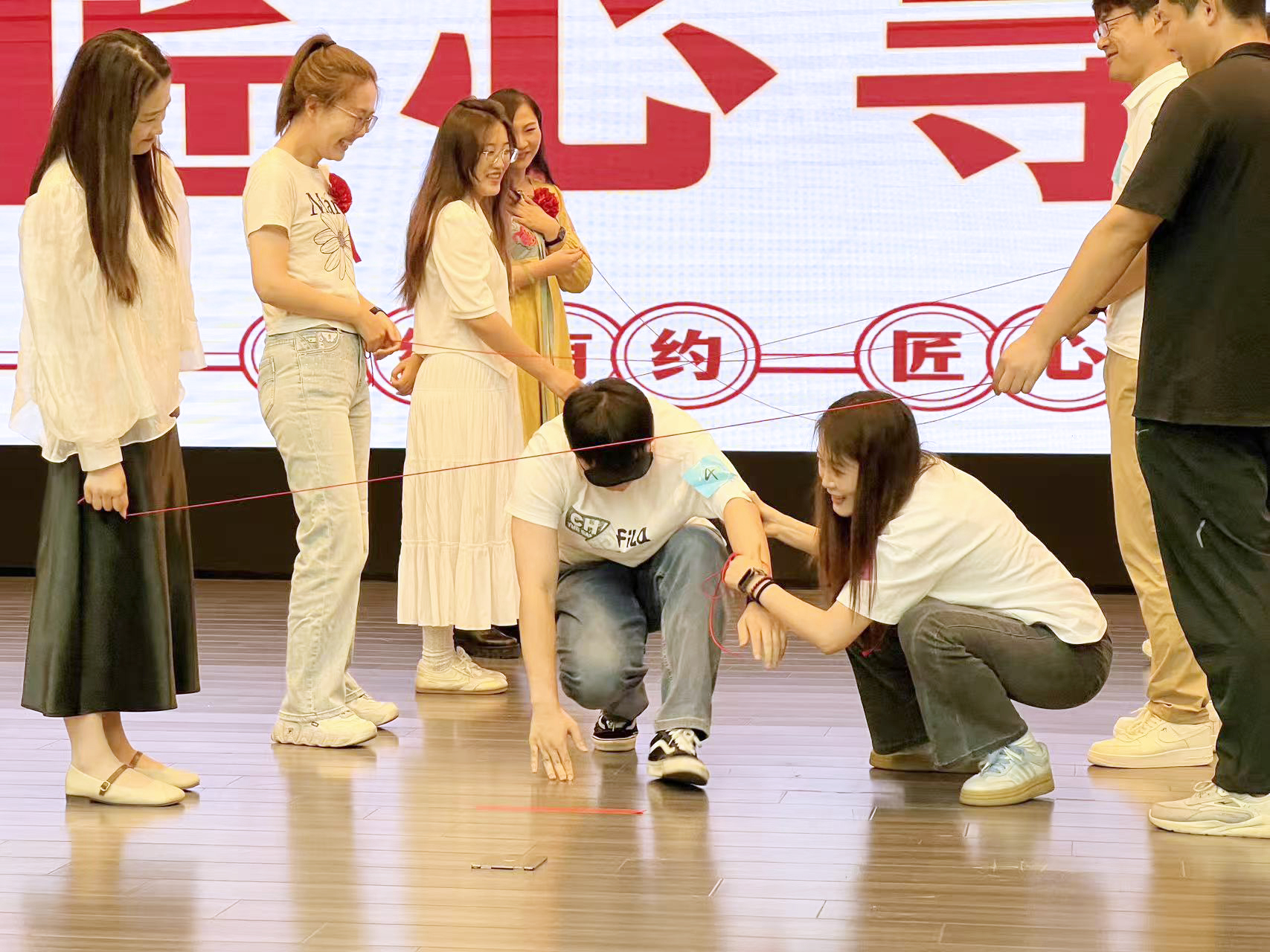 联谊环节紧扣“匠心”与“合作”主题,精心设计了多项互动游戏。“工匠接力”中,男女职工分组协作搭建积木,男生负责基础支撑,女生完成精细构造,默契在协作中自然流淌;“匠心寻缘”环节,红绳相牵、蒙眼引路,男生仅凭肢体动作引导女生安全过“桥”,信任在不言中悄然建立;“心跳叠叠杯”更是将气氛点燃,男女穿插配合、争分夺秒,现场欢笑声、加油声此起彼伏。