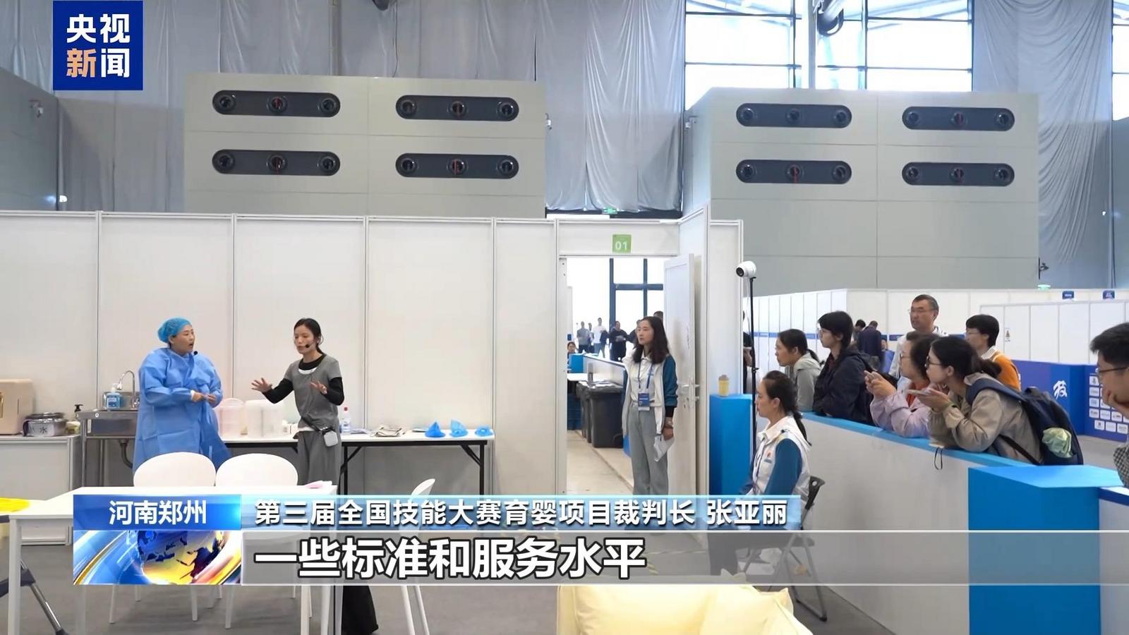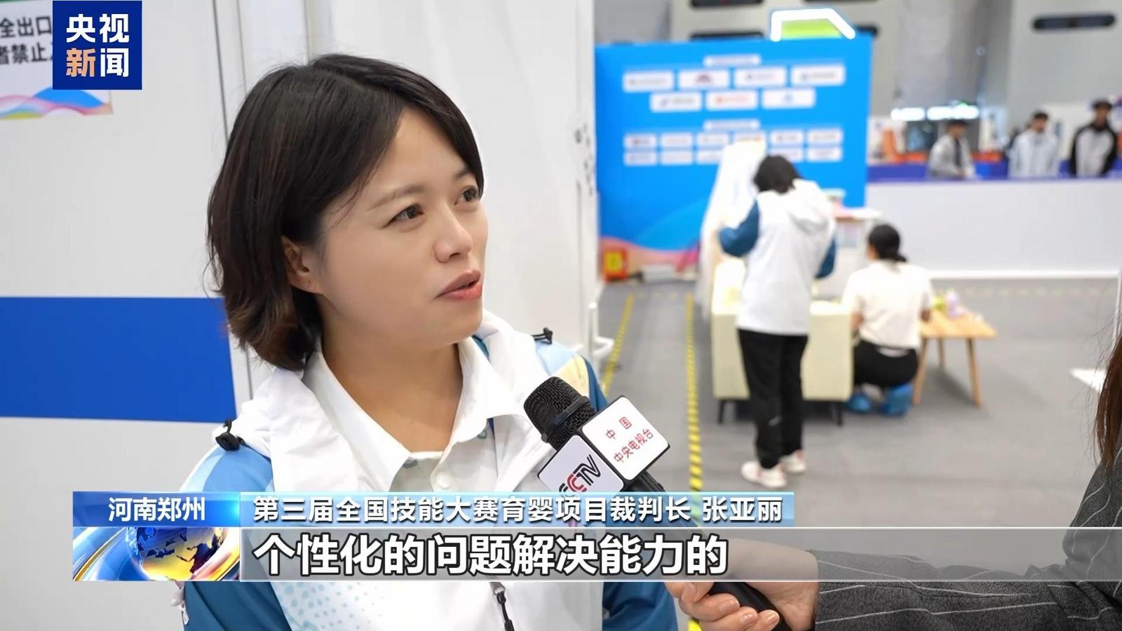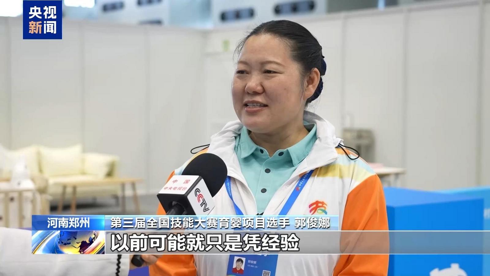 第三届全国技能大赛育婴项目选手 郭俊娜:比如给宝宝喂奶,以前可能只是凭经验,现在就要求抱孩子45度斜角。把流程标准化了,能够更好地服务婴幼儿以及家庭。