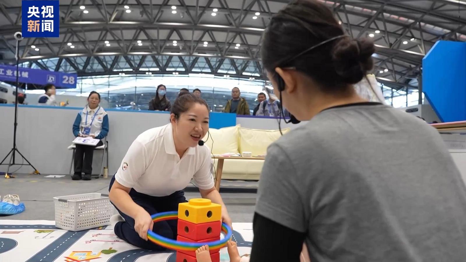 赛场上,一个个格子间按照真实居家场景布置,选手们按照流程,完成从上门拜访、婴儿互动、游戏设计、家长交流等系列服务工作。记者注意到,这次比赛创新引入会哭闹的智能化模拟婴儿,选手抱姿不对、饥饿都会有数据反馈,考验选手的回应性照顾能力,同时邀请了一些婴幼儿家长进行配合互动。