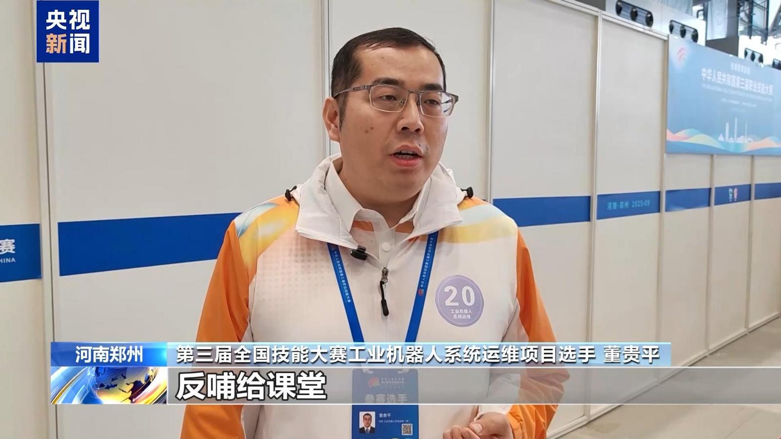 第三届全国技能大赛工业机器人系统运维项目选手 董贵平:能够把学到的一些实操技能以及理论知识,反哺给课堂,提升学生的理论储备以及实操的技能。