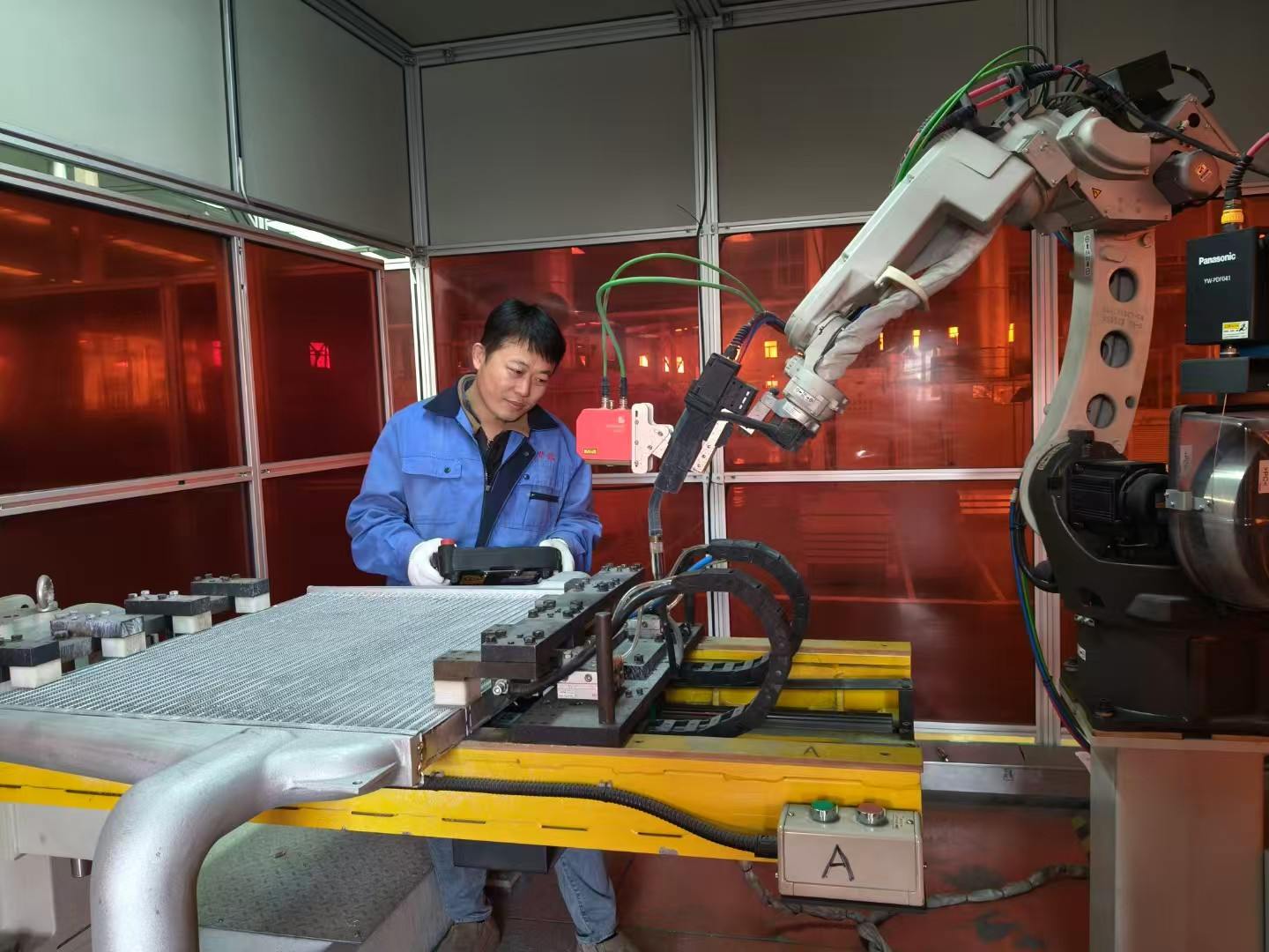 传统中冷器焊接依赖人工,不仅效率低,更易因力度不均、温度失控导致产品变形;产品换型时的设备调试与程序调整需数小时,严重制约生产进度。针对这些痛点,钱宏林带队攻克焊接机器人离线预编程技术,将不同型号产品的焊接参数、路径规划预设入系统。生产中,设备可自动完成产品转入、精准焊接、成品转出全流程,无需人工干预;多型号换型仅需调用预设程序,时间从数小时缩短至分钟级,大幅提升生产效率。该柔性加工方案落地,既为企业节省大量人力与时间成本,更推动中冷器焊接实现从人工依赖到智能驱动的转型。