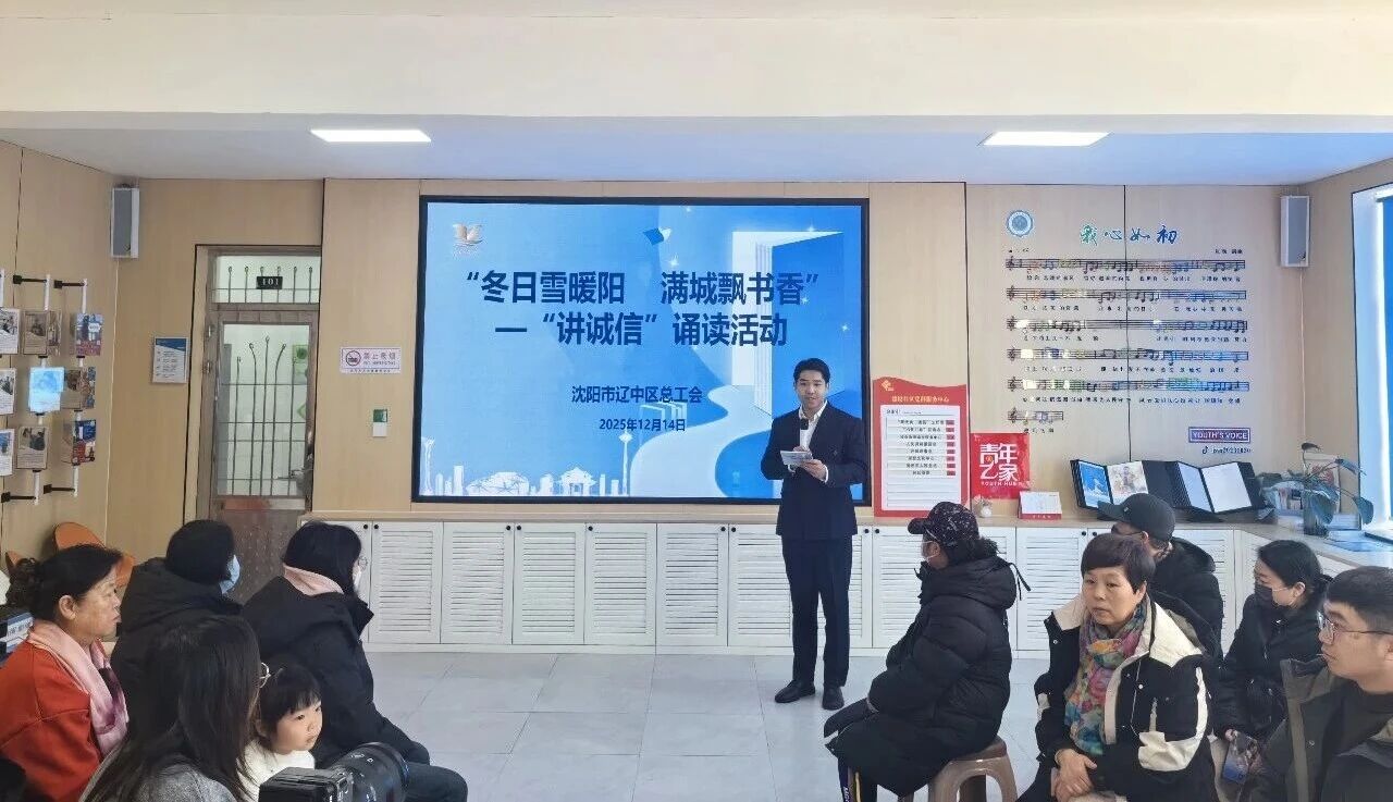 诚信的故事,在历史长河中代代相传;诚信的力量,在经典篇章中熠熠生辉。12月14日,沈阳市辽中区“冬日雪暖阳 满城飘书香”——“讲诚信”诵读活动(区总工会专场)在蒲西街道建设社区举行。活动邀请沈阳市劳动模范、市区两级“五一”劳动奖章获得者、2025年辽中区“百年工运 盛世中华”职工诵读活动获奖者作为本次活动的诵读者,他们以诵读为媒,以经典为证,让诚信之声穿透冬日寒意,让职工群众在纯粹的文化浸润中感悟诚信内涵,传递向善力量。