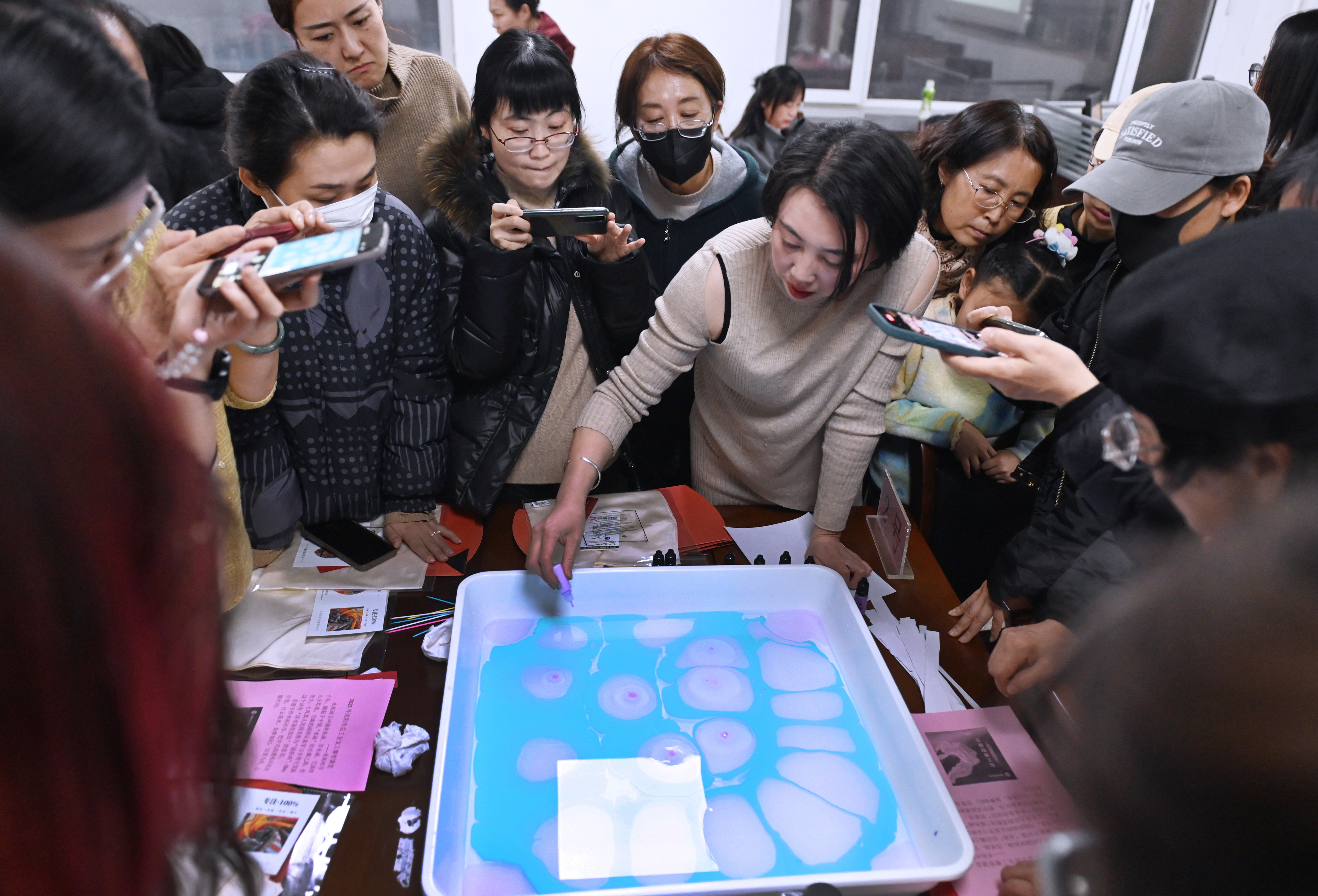 随后,在老师的引导下,女职工纷纷拿起工具,从调制画液开始,小心翼翼地在水面上滴洒颜料。她们或轻轻搅动,让色彩在水中自由舞动;或巧妙布局,让图案在丝巾上呈现出独特的韵味。当水中生花,当丝巾遇水,原本空白的织物上竟绽放出惊艳的“水中花”,轻轻取出进行清洗,晾干后,一幅独一无二的作品即呈现出来。