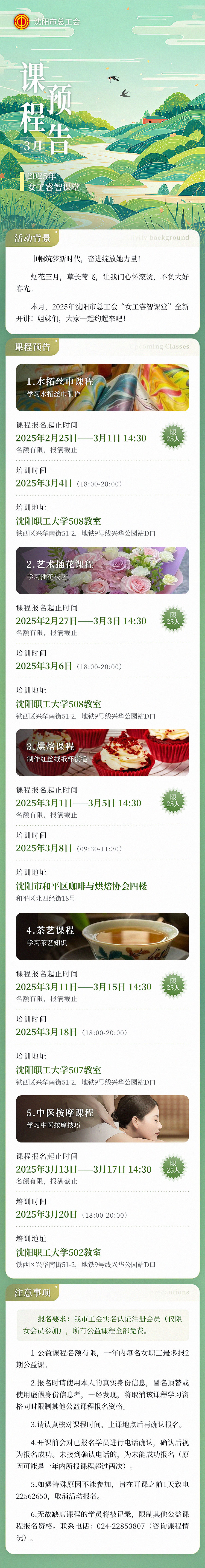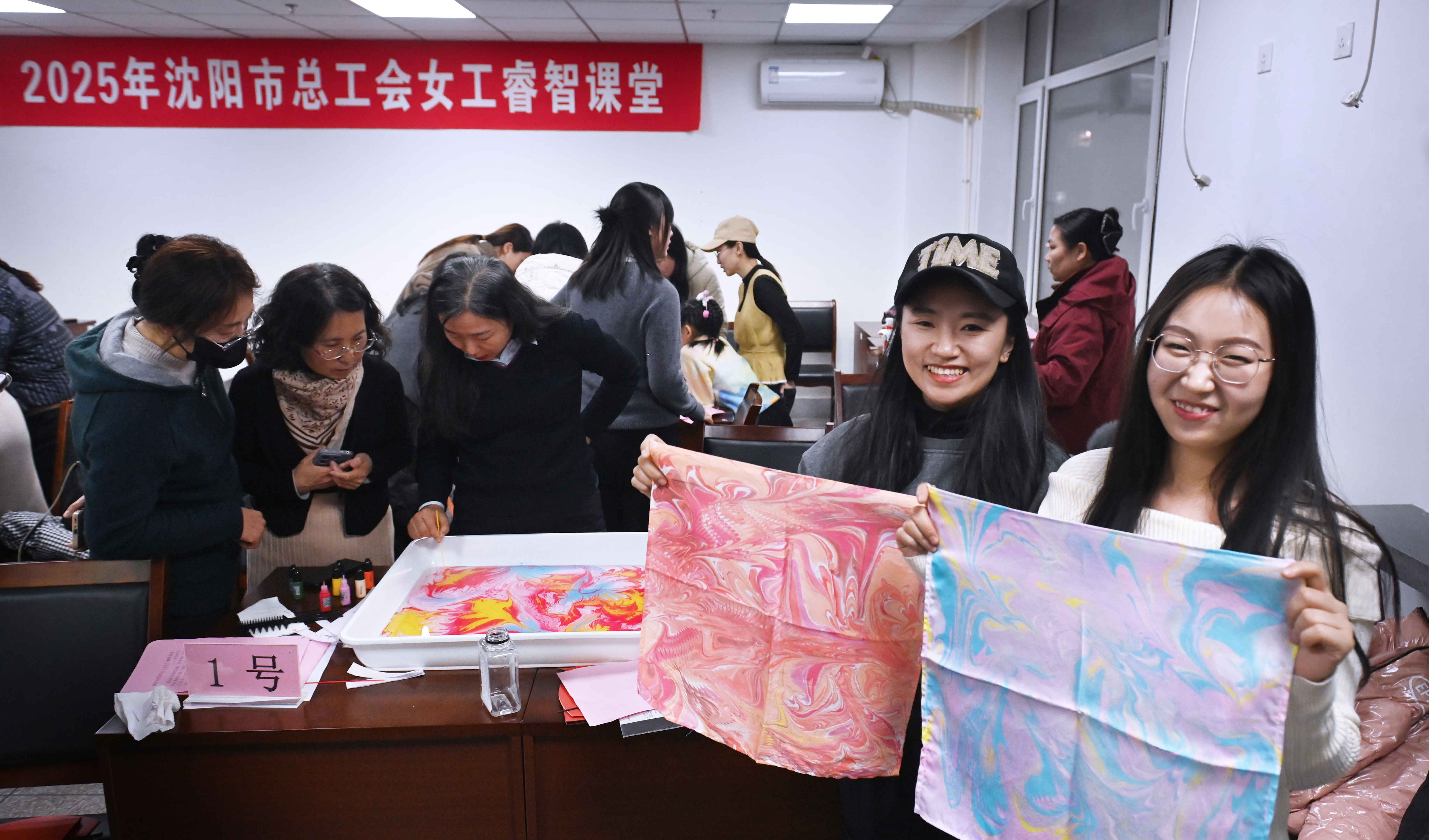 沈阳市总工会女职工部相关负责人介绍,3月,沈阳市总工会以“巾帼筑梦新时代 奋进绽放她力量”为主题,精心策划了2025年庆祝“三八”国际劳动妇女节全市工会系统女职工系列活动,邀约女职工共赴一场春日盛宴。作为系列活动之一,2025年“女工睿智课堂”面向全市女职工免费开设水拓丝巾制作、烘焙、插花技艺、茶艺知识、中医按摩等方面课程。