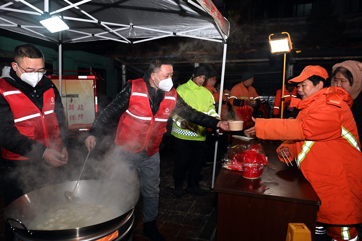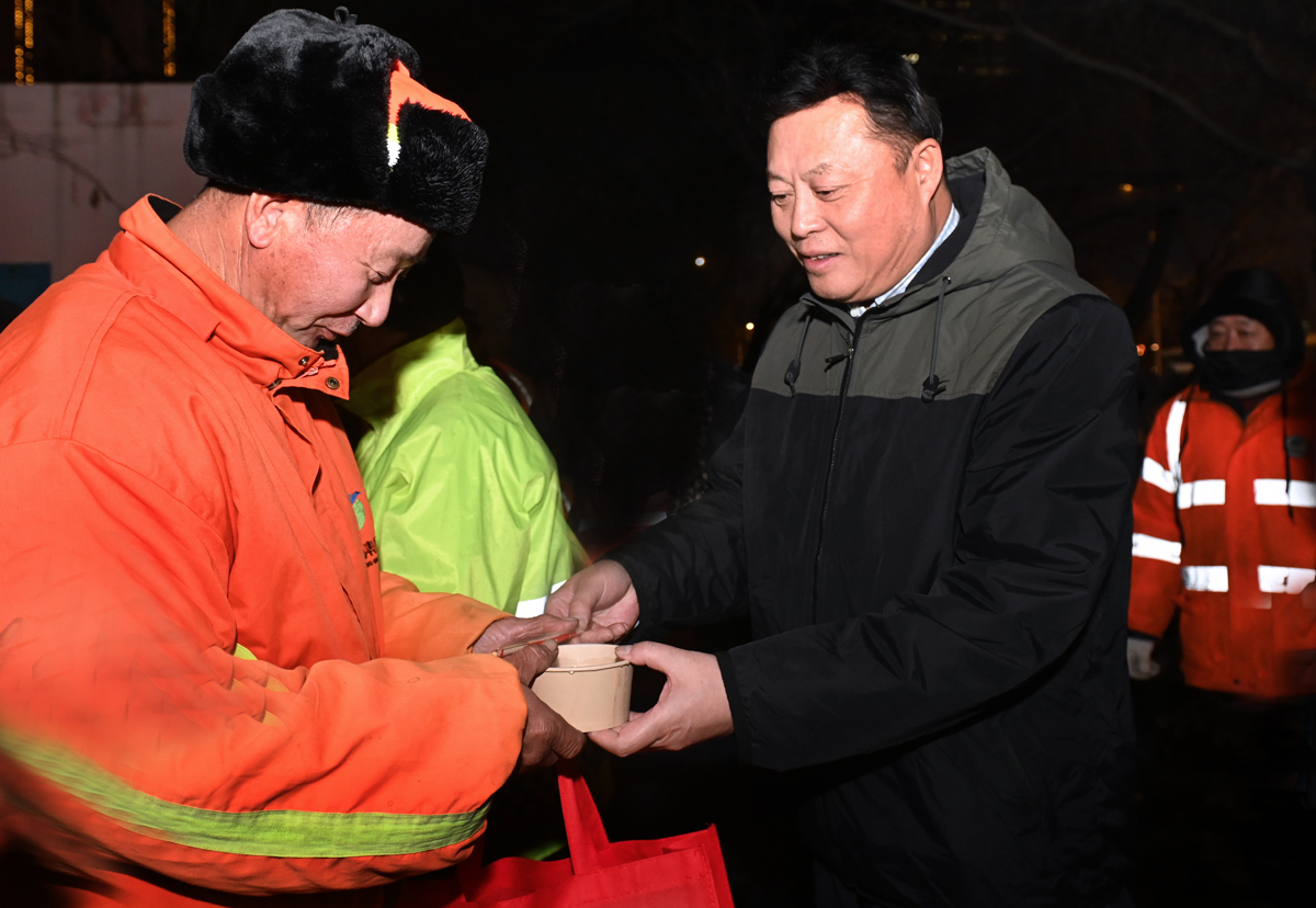 在工会驿站——市府环卫休息室站,驿站工作人员正忙碌地煮着一锅锅热气腾腾的饺子,暖意弥漫。慰问组将装满耳包、帽子、手套、护膝等防寒物品的“关爱礼包”递到环卫工人手中,也送上一份真挚的关怀。环卫工人祝铁男动情地说:“这天儿虽然冷,可心里头热乎得很!”