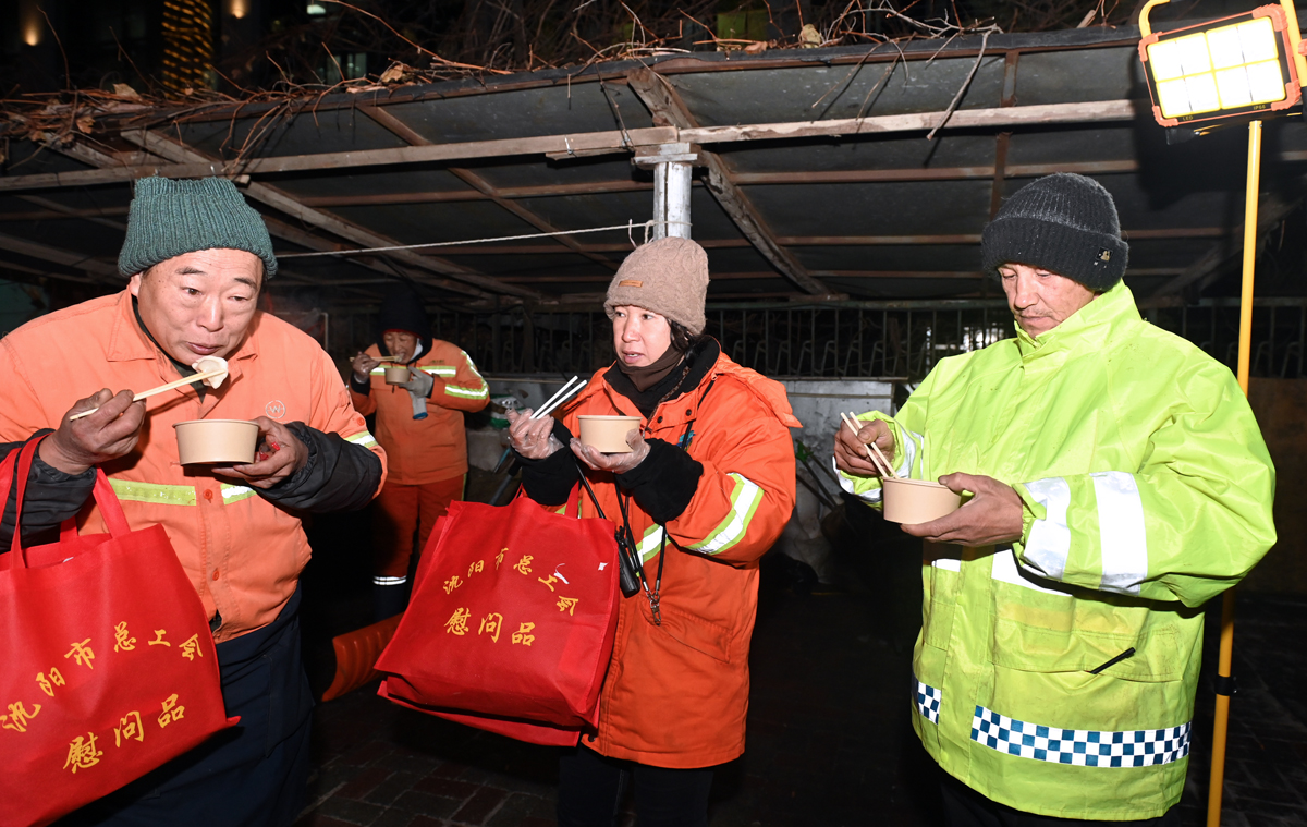 “每当遇到雨雪天气,都是大家最忙最累的时候。我代表市总工会,咱们职工的‘娘家人’,向大家表示感谢!虽然时间紧、任务重,但是大家在户外工作的时候一定要注意安全,做好防护。”12月23日,沈城降雪。市总工会在全市范围内开展暖心保运行和暖心伴同行慰问低温雨雪天气一线职工送温暖专项行动(以下简称送温暖专项行动),慰问组为环卫工人、快递小哥以及配电抢修分队等坚守一线的职工送温暖。