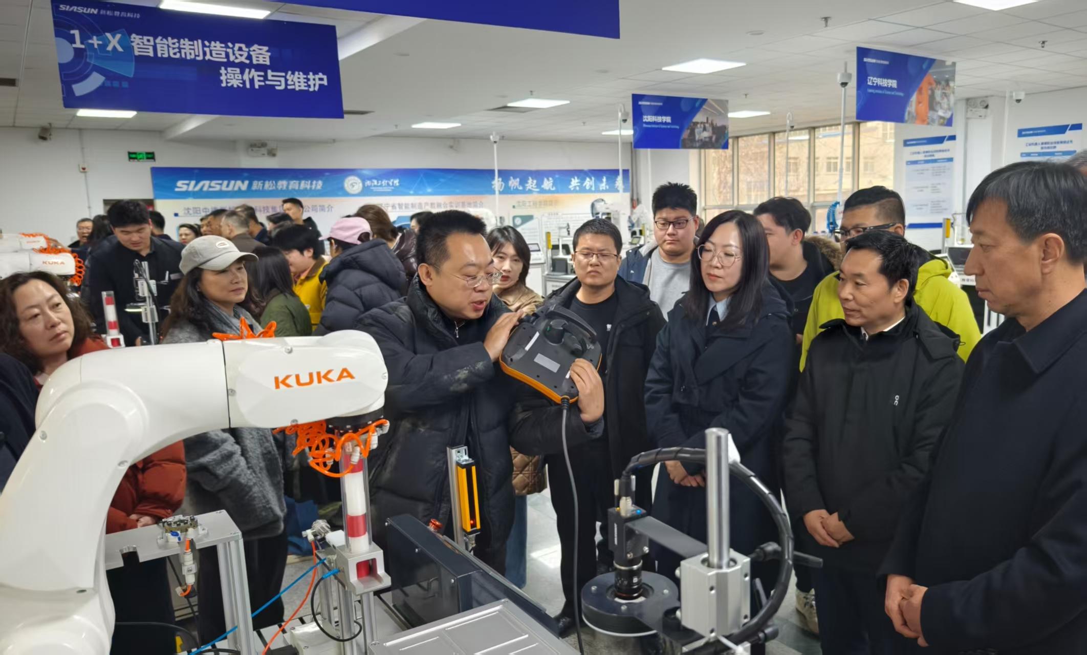 下午的现场教学环节,参训学员走进沈阳中德新松教育科技集团和沈阳人工智能计算中心,沉浸式感受数字化、智能化技术的硬核魅力,在实景观摩与亲身体验中,让数智理念入脑入心。工业机器人、数字化生产线、虚拟仿真场景逐一亮相,依托工业数字化、工业机器人、智能制造核心技术搭建的智能教育生态,让学员们直观领略到“硬件支撑+软件赋能+全链服务”的数智化体系魅力。大家纷纷驻足观摩,戴上VR设备感受虚拟实训场景,亲手操作六轴机器人体验智能操控,新奇的技术体验、前沿的智造成果,让现场赞叹声不断。