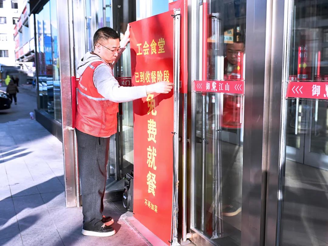 在工会食堂所在的沈河区御点江山商厦外,立着一块提示牌:“工会食堂已到收餐阶段,免费就餐。”没有大张旗鼓的宣传,也没有繁琐的手续。每天下午3点左右,午餐供应进入尾声,这块牌子便会出现——食堂将剩余干净、热乎的饭菜,免费提供给任何有需要的人。