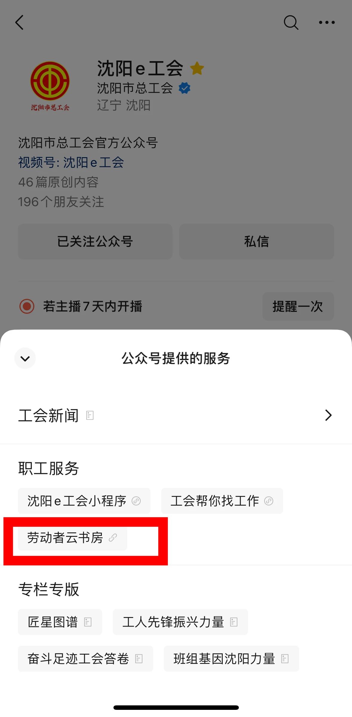 职工只需关注“沈阳e工会”微信公众号,进入“职工服务”菜单栏,点击“劳动者云书房”,即可自动注册,多终端同步阅读,碎片时间轻松“充电”。
